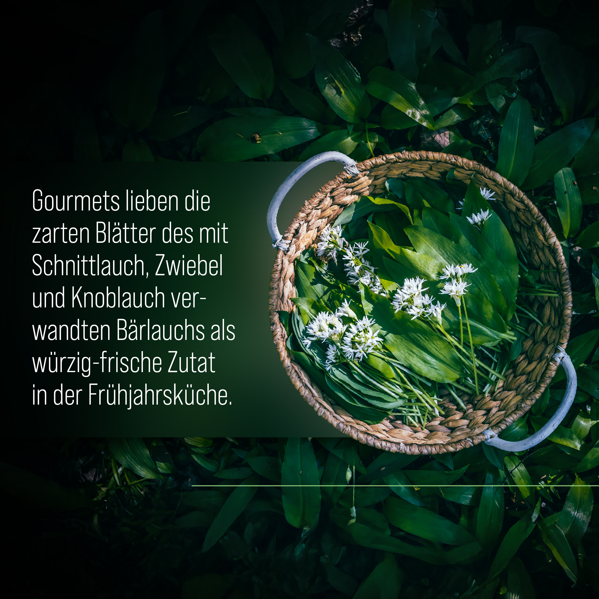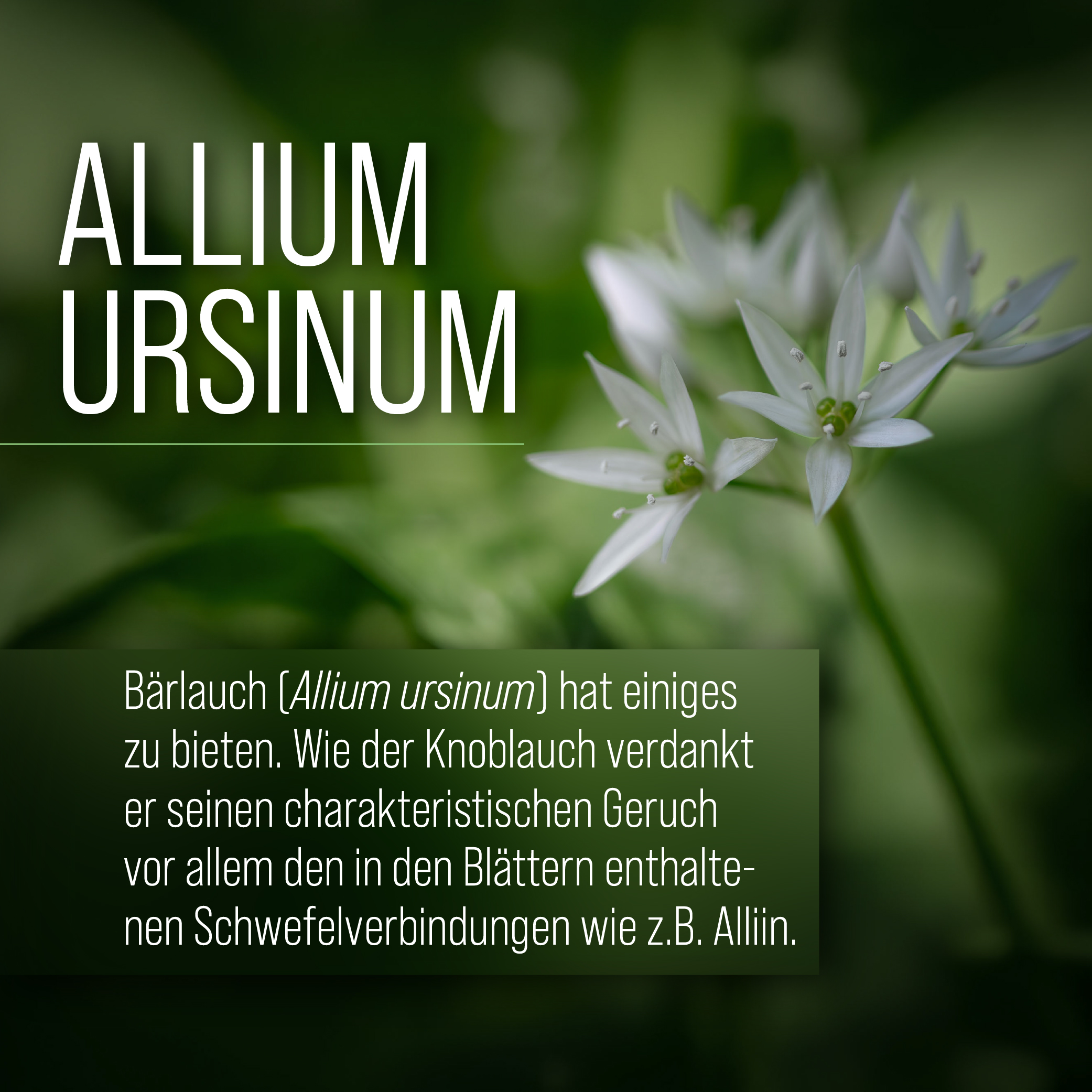 Gourmets lieben die zarten Blätter des mit Schnittlauch, Zwiebel und Knoblauch verwandten Bärlauchs als würzig-frische Zutat in der Frühjahrsküche. Auch in sonstiger Hinsicht hat Bärlauch einiges zu bieten. Wie der Knoblauch verdankt er seinen charakteristischen Geruch vor allem den in den Blättern enthaltenen Schwefelverbindungen wie z.B. Alliin.