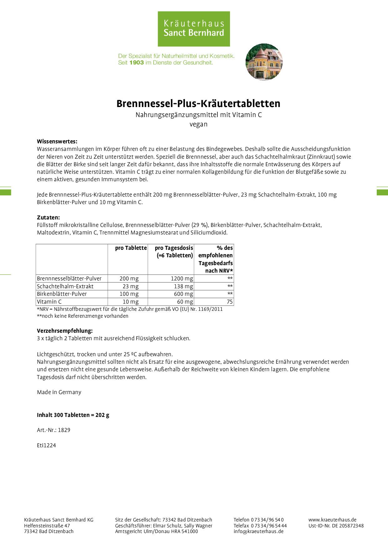 Jede Brennnessel-Plus-Kräutertablette enthält 200 mg Brennnesselblätter-Pulver, 23 mg Schachtelhalm-Extrakt, 100 mg Birkenblätter-Pulver und 10 mg Vitamin C.