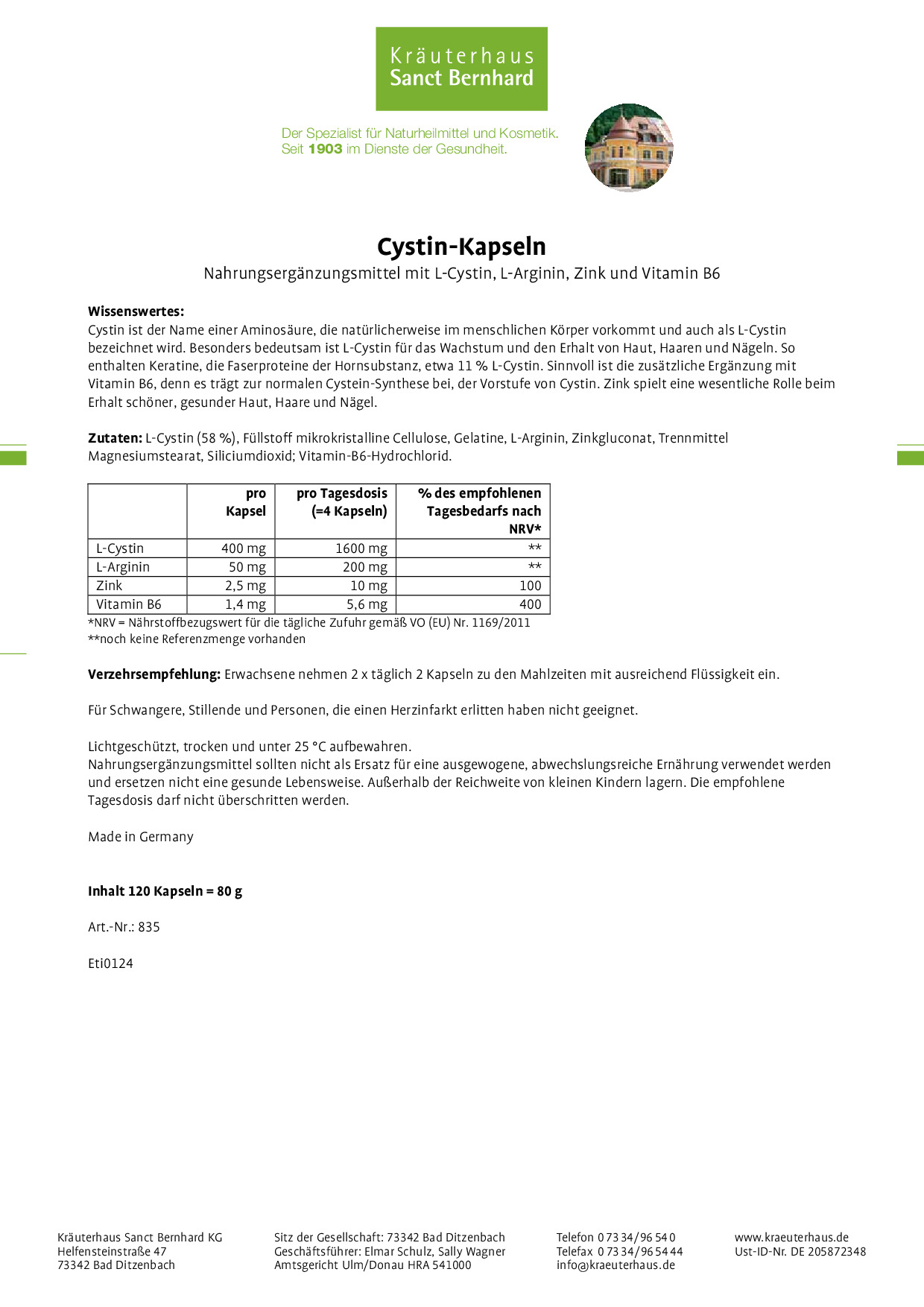 Wir, das Kräuterhaus Sanct Bernhard, sind ein traditionelles Familienunternehmen mit Sitz auf der schwäbischen Alb. Seit 1903 stellen wir hochwertige Nahrungsergänzungsmittel, Körperpflegeprodukte und Naturheilmittel her. Qualität wird bei uns großgeschrieben, denn Ihre Gesundheit liegt uns am Herzen.