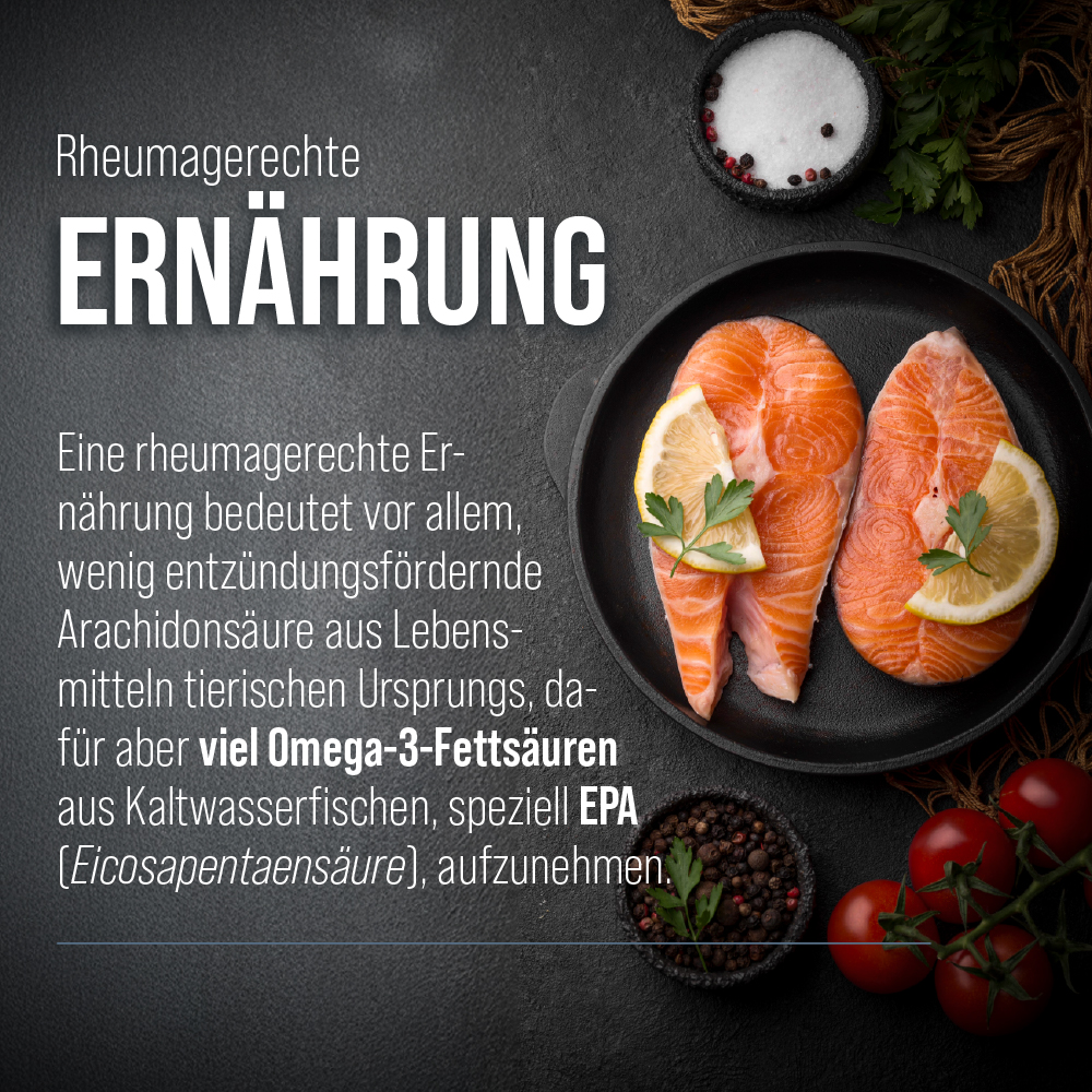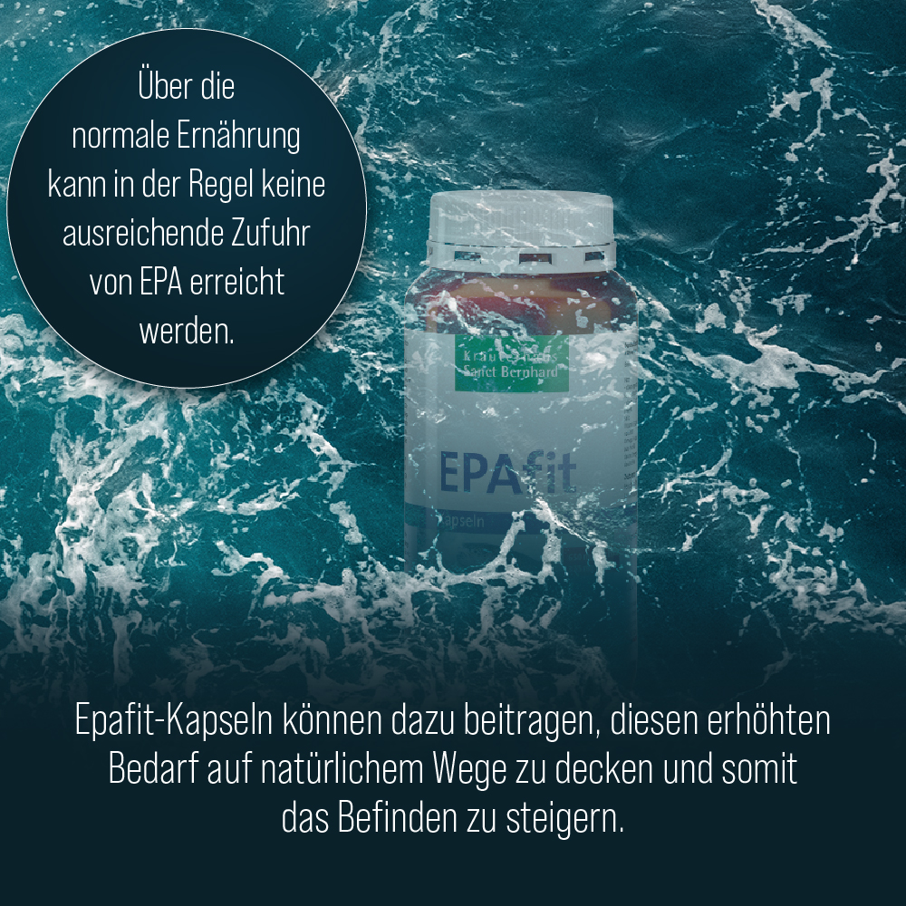 Wer unter schmerzhaften entzündlich-rheumatischen Beschwerden leidet, muss in besonderem Maße auf seine Ernährung achten. Eine rheumagerechte Ernährung bedeutet vor allem, wenig entzündungsfördernde Arachidonsäure aus Lebensmitteln tierischen Ursprungs, dafür aber viel Omega-3-Fettsäuren aus Kaltwasserfischen, speziell EPA (Eicosapentaensäure), aufzunehmen. Über die normale Ernährung kann jedoch in der Regel keine ausreichende Zufuhr von EPA erreicht werden. Epafit-Kapseln können dazu beitragen, diesen erhöhten Bedarf auf natürlichem Wege zu decken und somit das Befinden zu steigern.