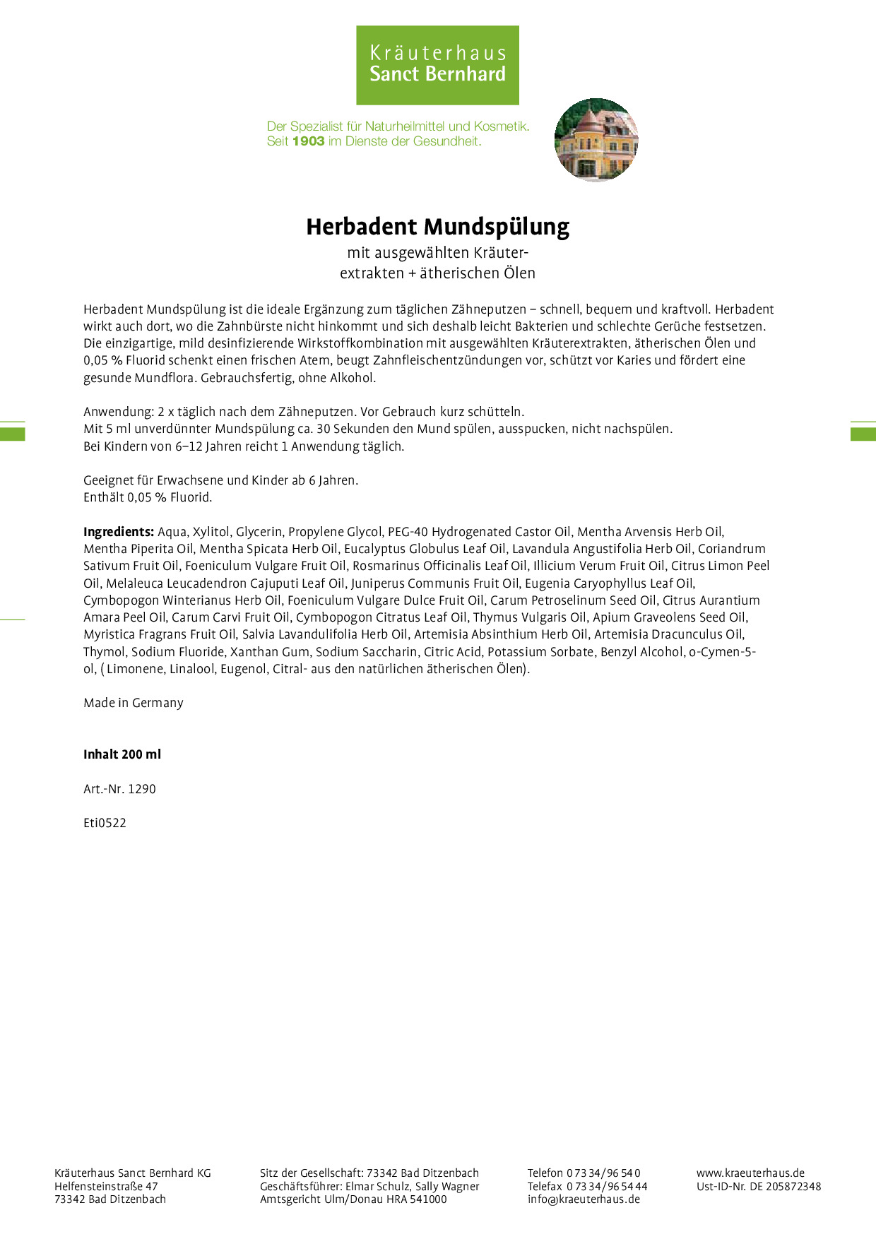 Herbadent Mundspülung ist die ideale Ergänzung zum täglichen Zähneputzen – schnell, bequem und kraftvoll. Herbadent wirkt auch dort, wo die Zahnbürste nicht hinkommt und sich deshalb leicht Bakterien und schlechte Gerüche festsetzen. Die einzigartige, mild desinfizierende Wirkstoffkombination mit ausgewählten Kräuter­extrakten, ätherischen Ölen und 0,05% Fluorid schenkt einen frischen Atem, beugt Zahnfleischentzündungen vor, schützt vor Karies und fördert eine gesunde Mundflora. Gebrauchsfertig, ohne Alkohol.
