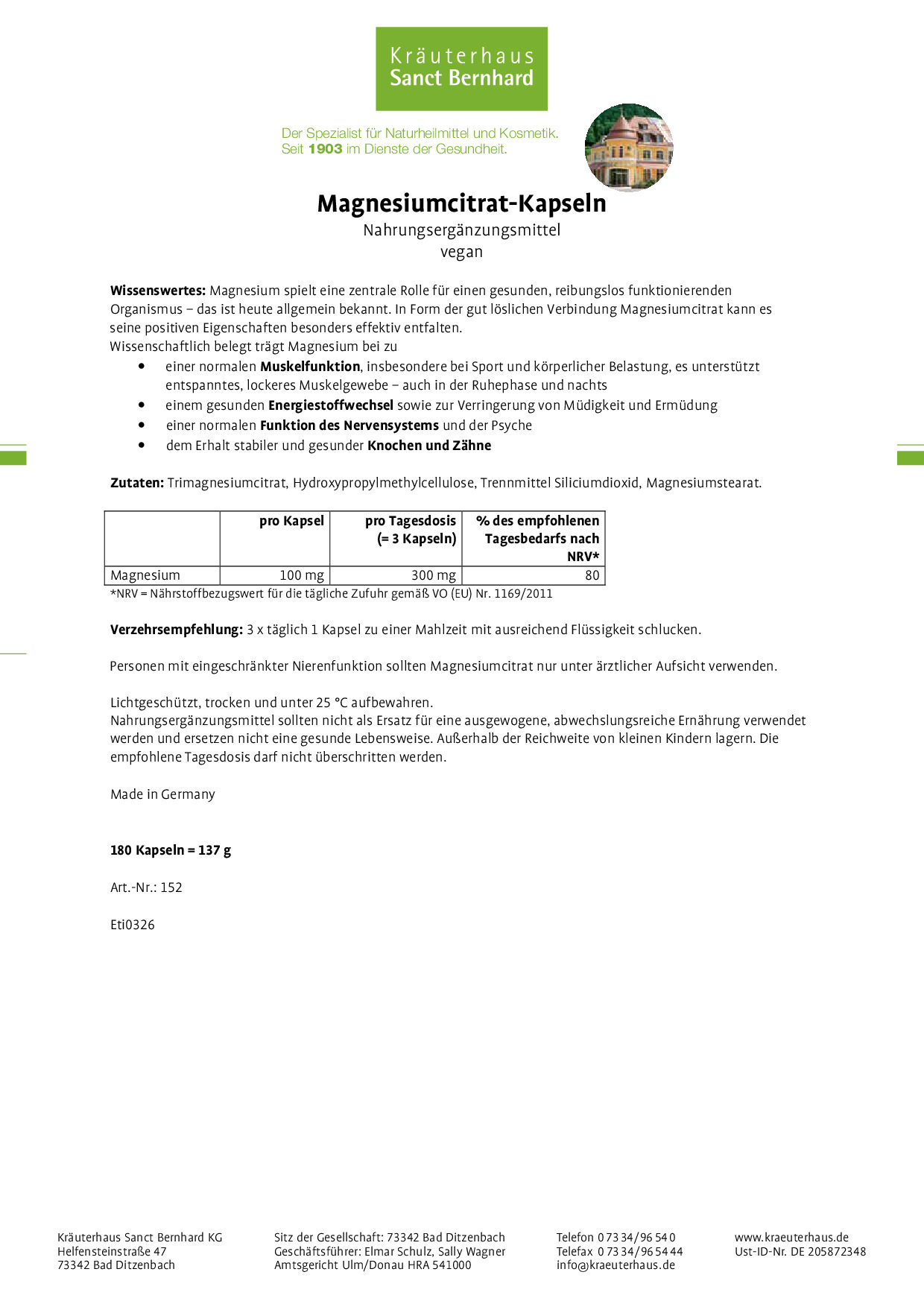 Zutaten: Trimagnesiumcitrat, Hydroxypropylmethylcellulose, Trennmittel Siliciumdioxid, Magnesiumstearat.