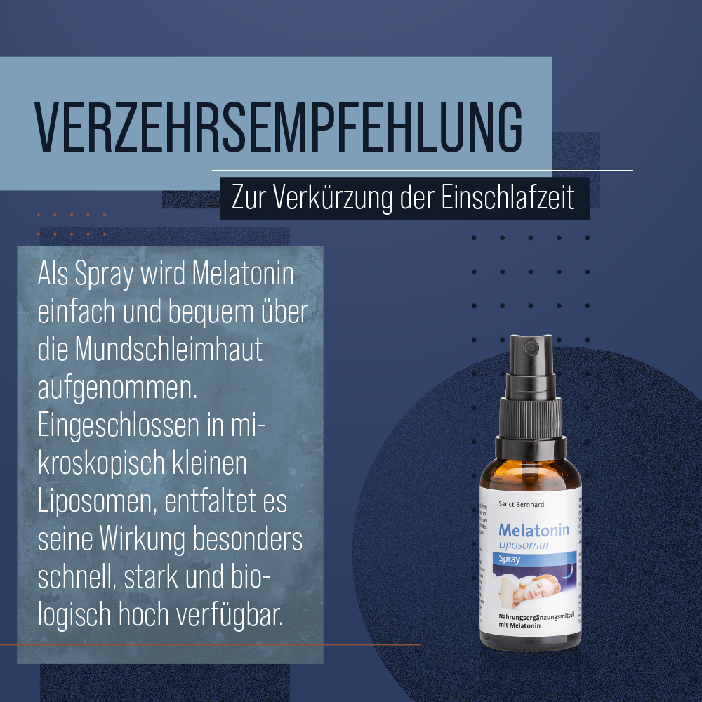 Verzehrempfehlung: Zur Verkürzung der Einschlafzeit: Zwei Sprühstöße (1mg) kurz vor dem Schlafengehen direkt in den Mund geben. Vor dem Schlucken ca. 10 Sekunden im Mund belassen.