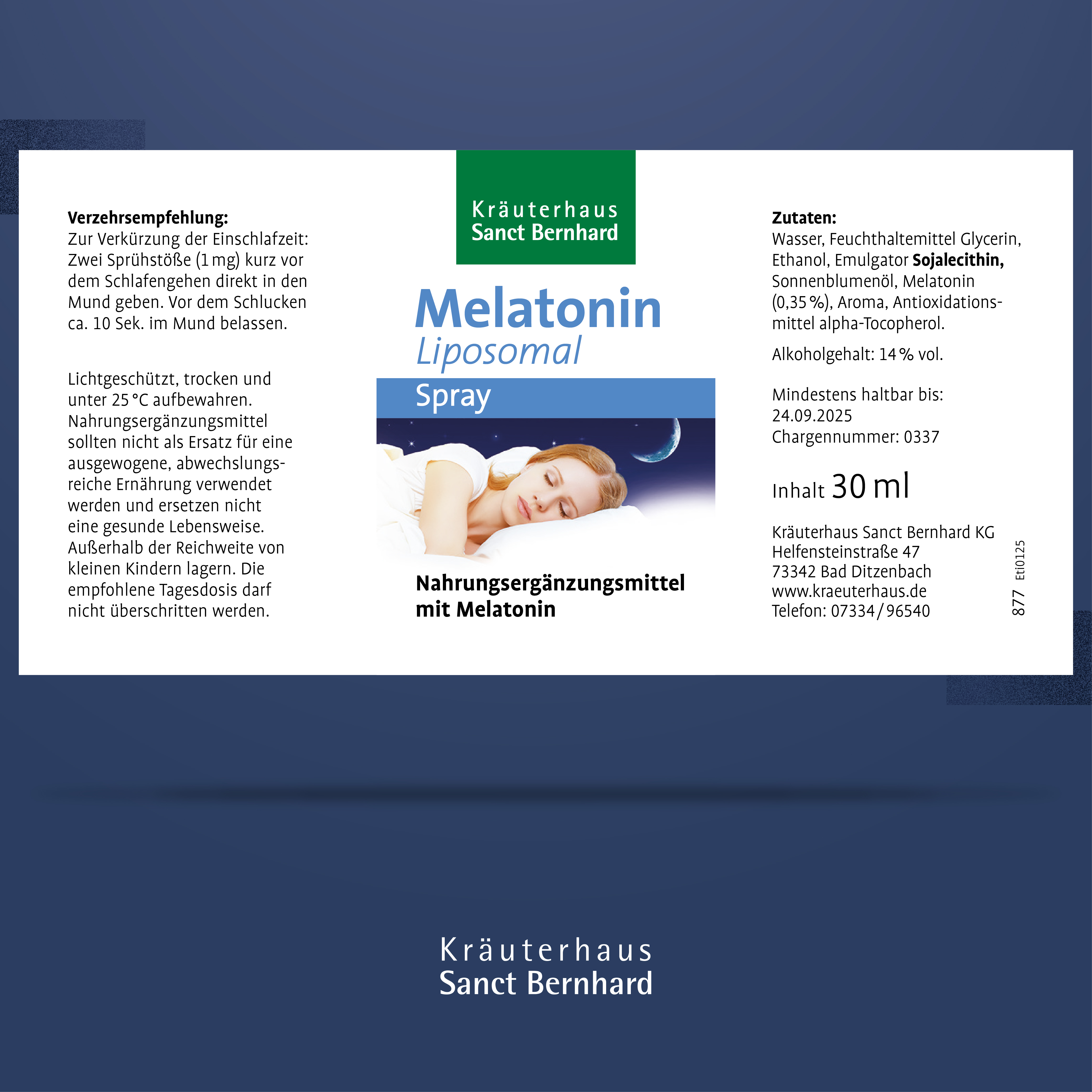 Zutaten: Wasser, Feuchthaltemittel Glycerin, Ethanol, Emulgator Sojalecithin, Sonnenblumenöl, Melatonin (0,35 %), Aroma, Antioxidationsmittel alpha-Tocopherol.