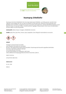 Inhaltsstoffe: Alkohol, Wasser, Emulgator, Zirbelkieferöl, Limonene.