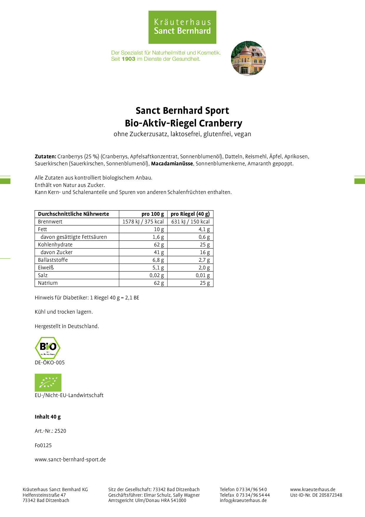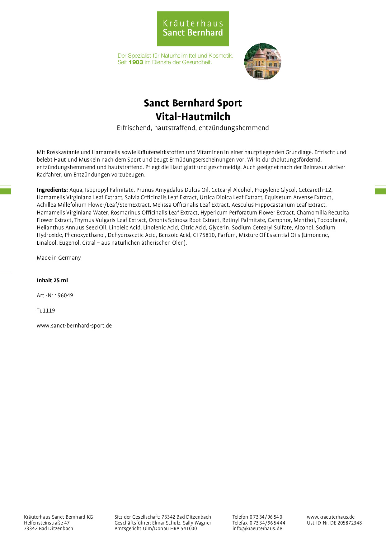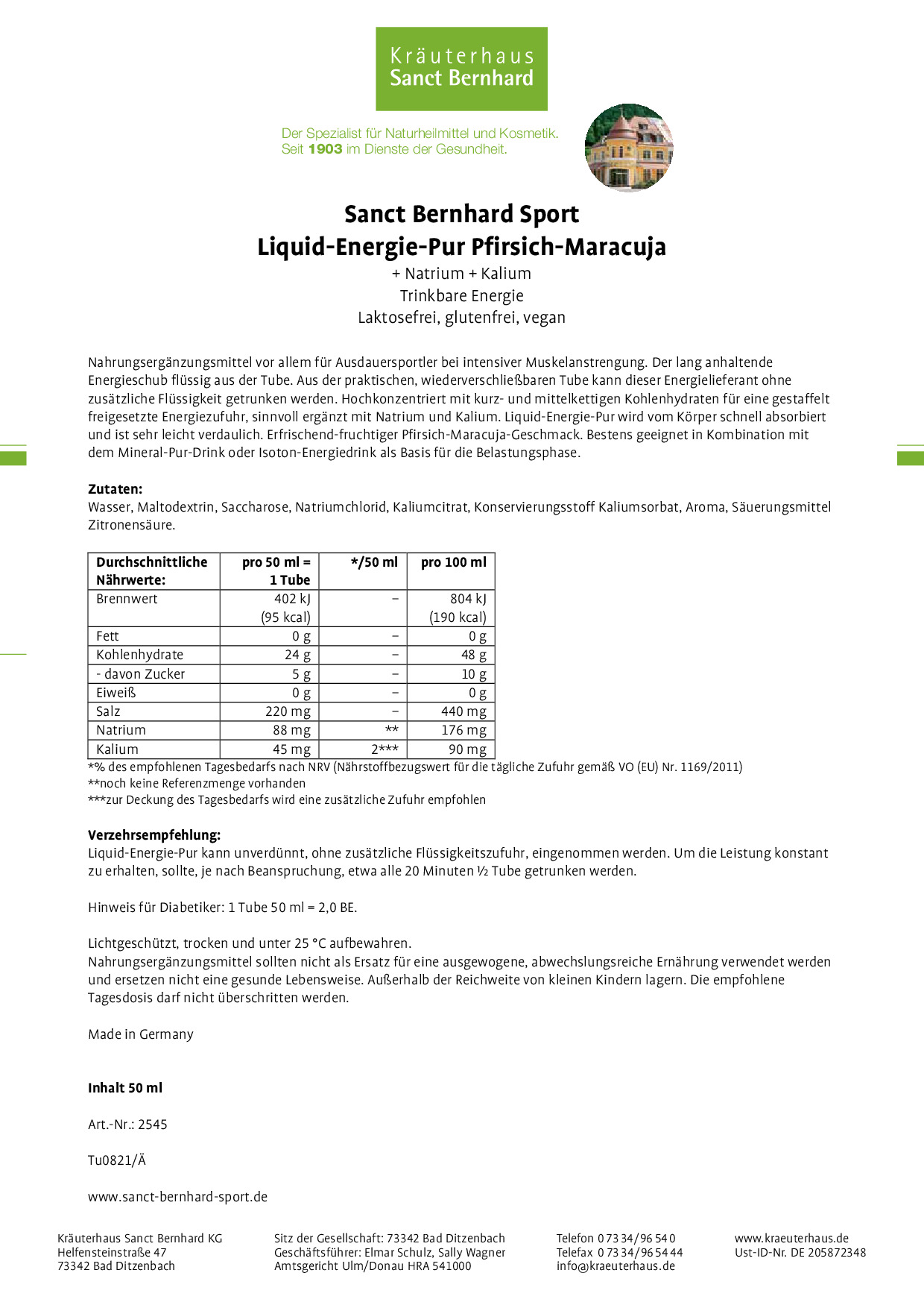 Wir, das Kräuterhaus Sanct Bernhard, sind ein traditionelles Familienunternehmen mit Sitz auf der schwäbischen Alb. Seit 1903 stellen wir hochwertige Nahrungsergänzungsmittel, Körperpflegeprodukte und Naturheilmittel her. Qualität wird bei uns großgeschrieben, denn Ihre Gesundheit liegt uns am Herzen.