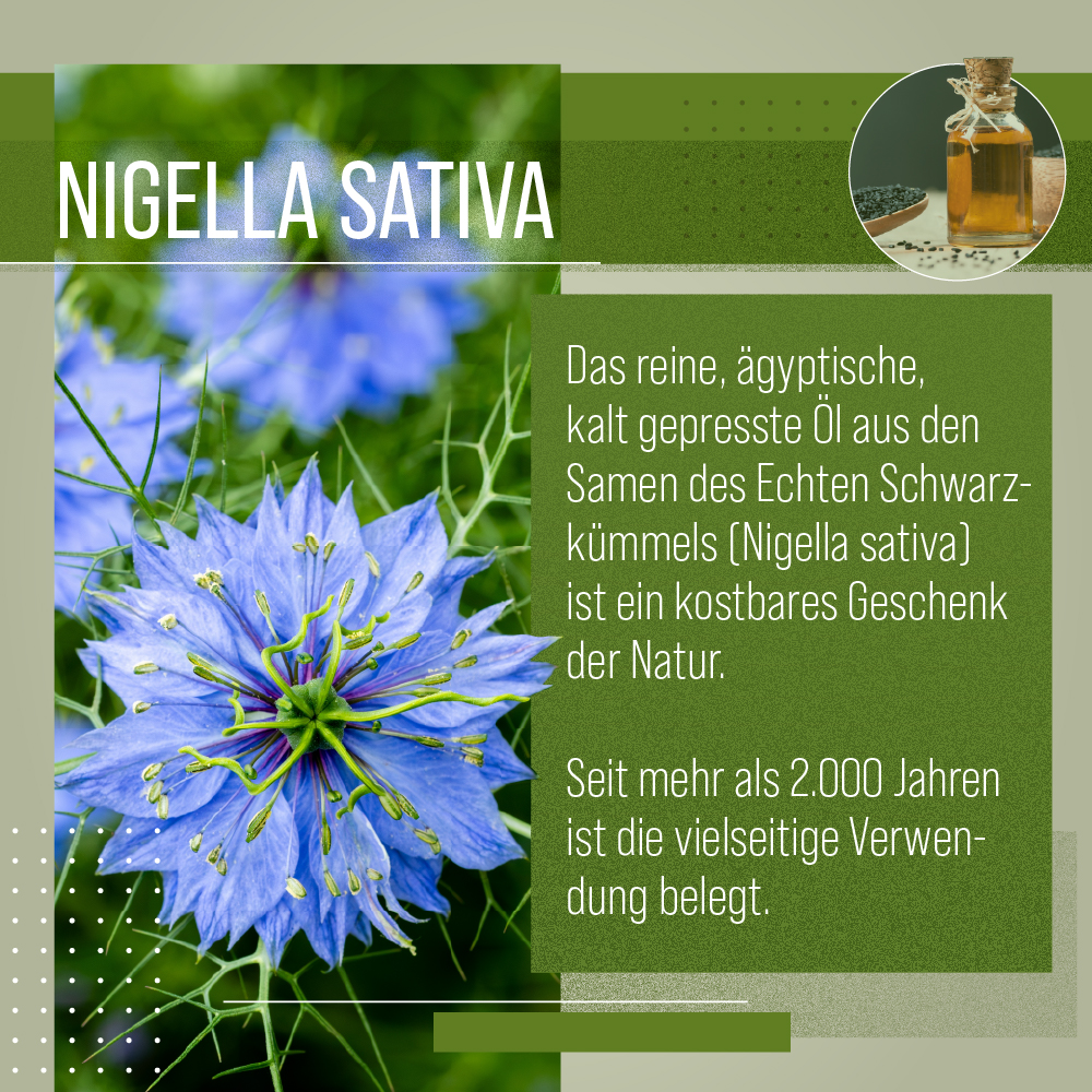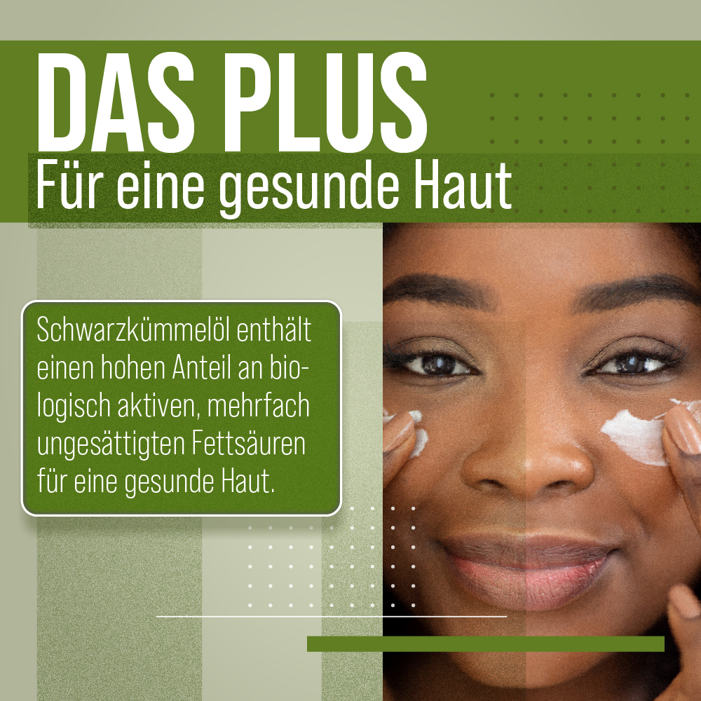 - Schwarzkümmelöl enthält einen hohen Anteil an biologisch aktiven, mehrfach ungesättigten Fettsäuren für eine gesunde Haut.
