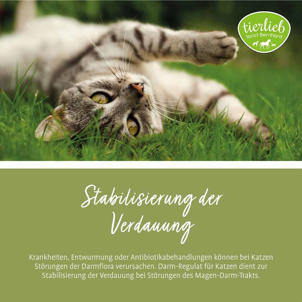 Krankheiten, Entwurmung oder Antibiotikabehandlungen können bei Katzen Störungen der Darmflora verursachen. Darm-Regulat für Katzen dient zur Stabilisierung der Verdauung bei Störungen des Magen-Darm-Trakts.