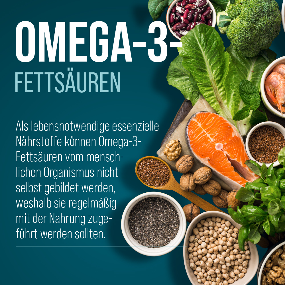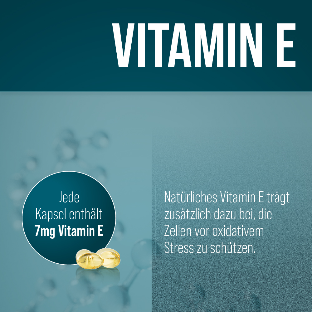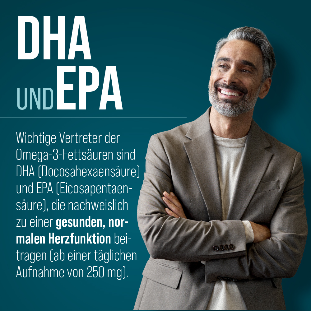 Als lebensnotwendige essenzielle Nährstoffe können Omega-3-Fettsäuren vom menschlichen Organismus nicht selbst gebildet werden, weshalb sie regelmäßig mit der Nahrung zugeführt werden sollten. Wichtige Vertreter der Omega-3-Fettsäuren sind DHA (Docosahexaensäure) und EPA (Eicosapentaensäure), die nachweislich zu einer gesunden, normalen Herzfunktion beitragen (ab einer täglichen Aufnahme von 250 mg). Natürliches Vitamin E trägt zusätzlich dazu bei, die Zellen vor oxidativem Stress zu schützen.