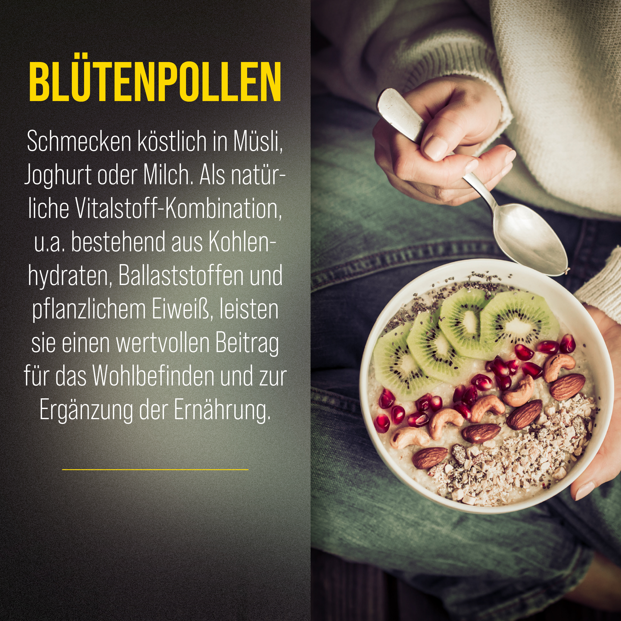 Blütenpollen schmecken köstlich in Müsli, Joghurt oder Milch. Als natürliche Vitalstoff-Kombination, unter anderem bestehend aus Kohlenhydraten, Ballaststoffen und pflanzlichem Eiweiß, leisten sie einen wertvollen Beitrag für das Wohlbefinden und zur Ergänzung der Ernährung.