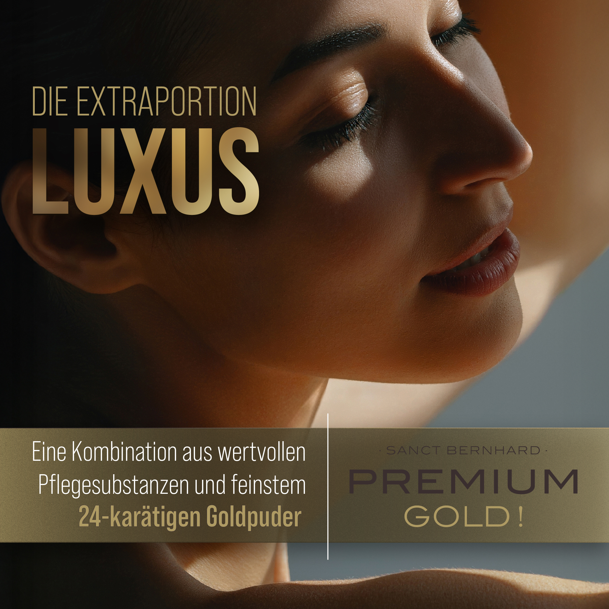 Unsere Kosmetikserie Sanct Bernhard Premium Gold! kombiniert erlesene, kostbare Pflege- und Aufbausubstanzen mit feinstem 24-karätigen Goldpuder. Das dürfen Sie erwarten: Eine Extraportion Luxus, die Ihre Haut wunderbar pflegt. Die exklusiven Inhaltsstoffe schenken Ihnen ein frisches, straffes, verjüngtes Hautbild. Genießen Sie das Gefühl, sich mit dem Besten zu verwöhnen.